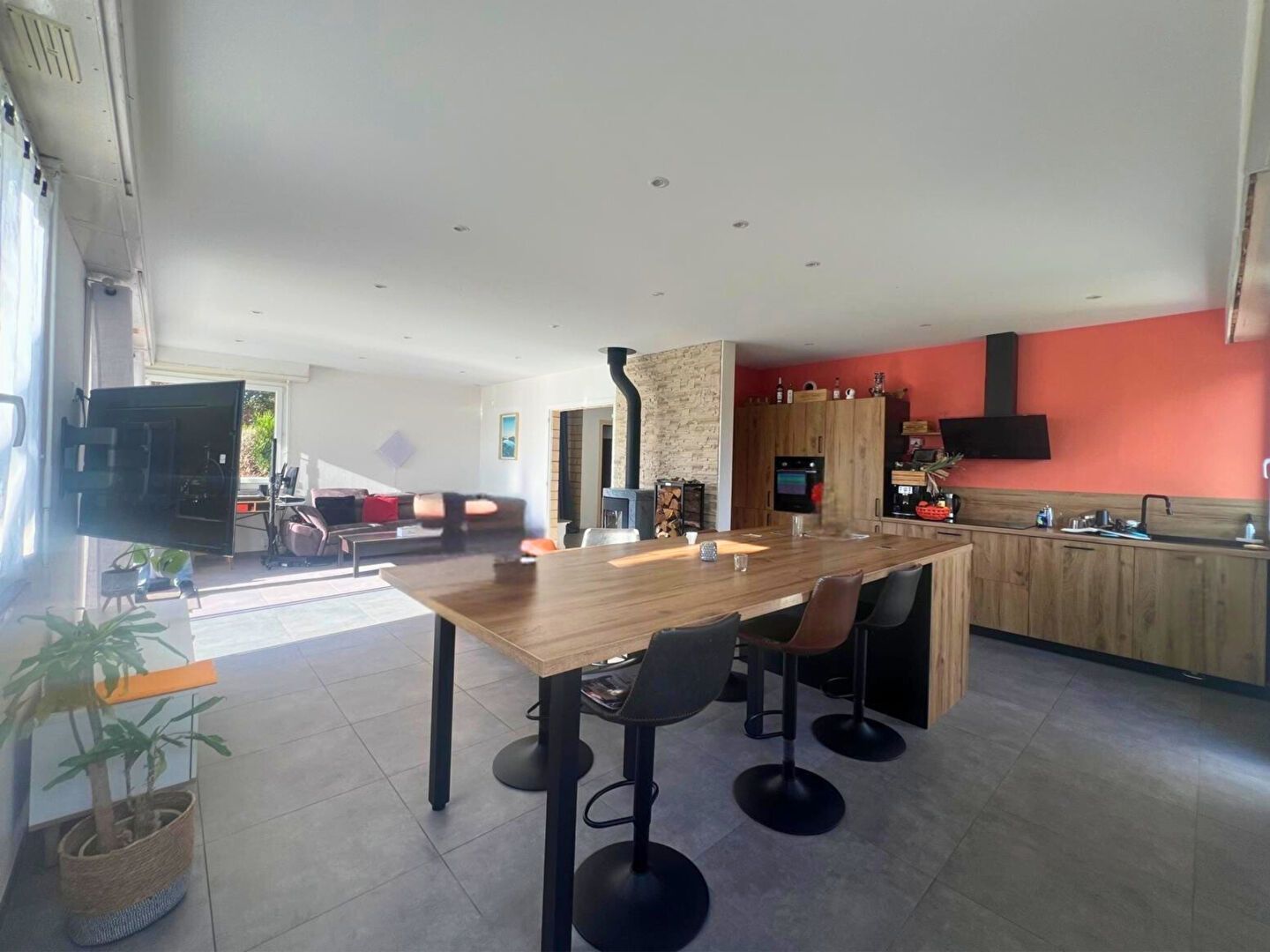 L'intérieur, rafraîchi récemment, offre une ambiance chaleureuse avec une entrée accueillante qui mène vers un salon-séjour baigné de lumière et de chaleur grâce à son poêle à bois. La cuisine américaine ouverte apporte une vraie convivialité et un esprit moderne, parfaits pour les moments en famille ou entre amis. Le rez-de-chaussée comprend également un WC, trois chambres confortables, une salle d'eau fonctionnelle et un grand cellier.