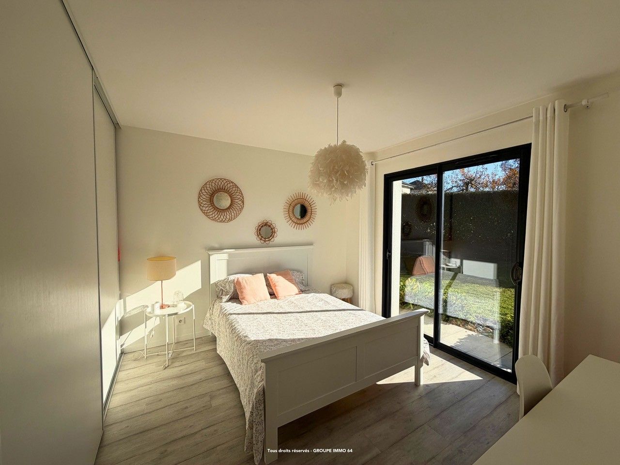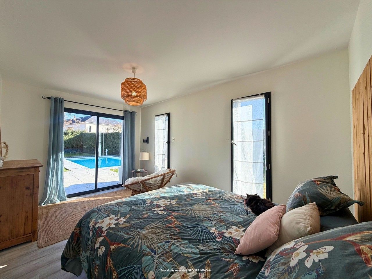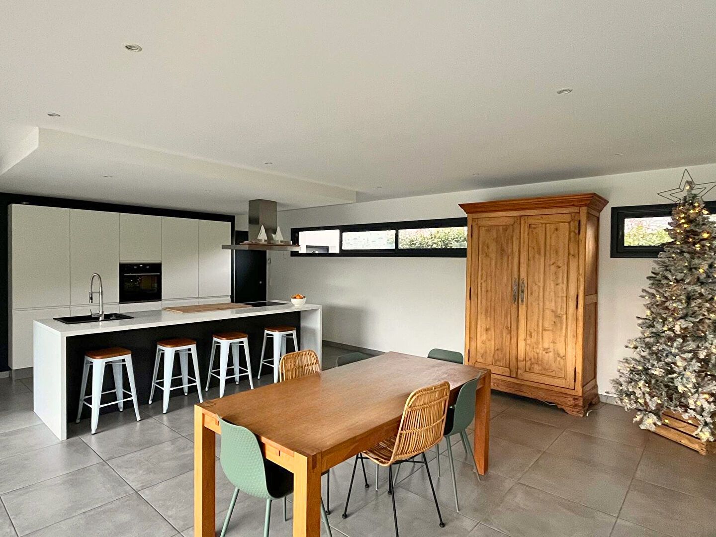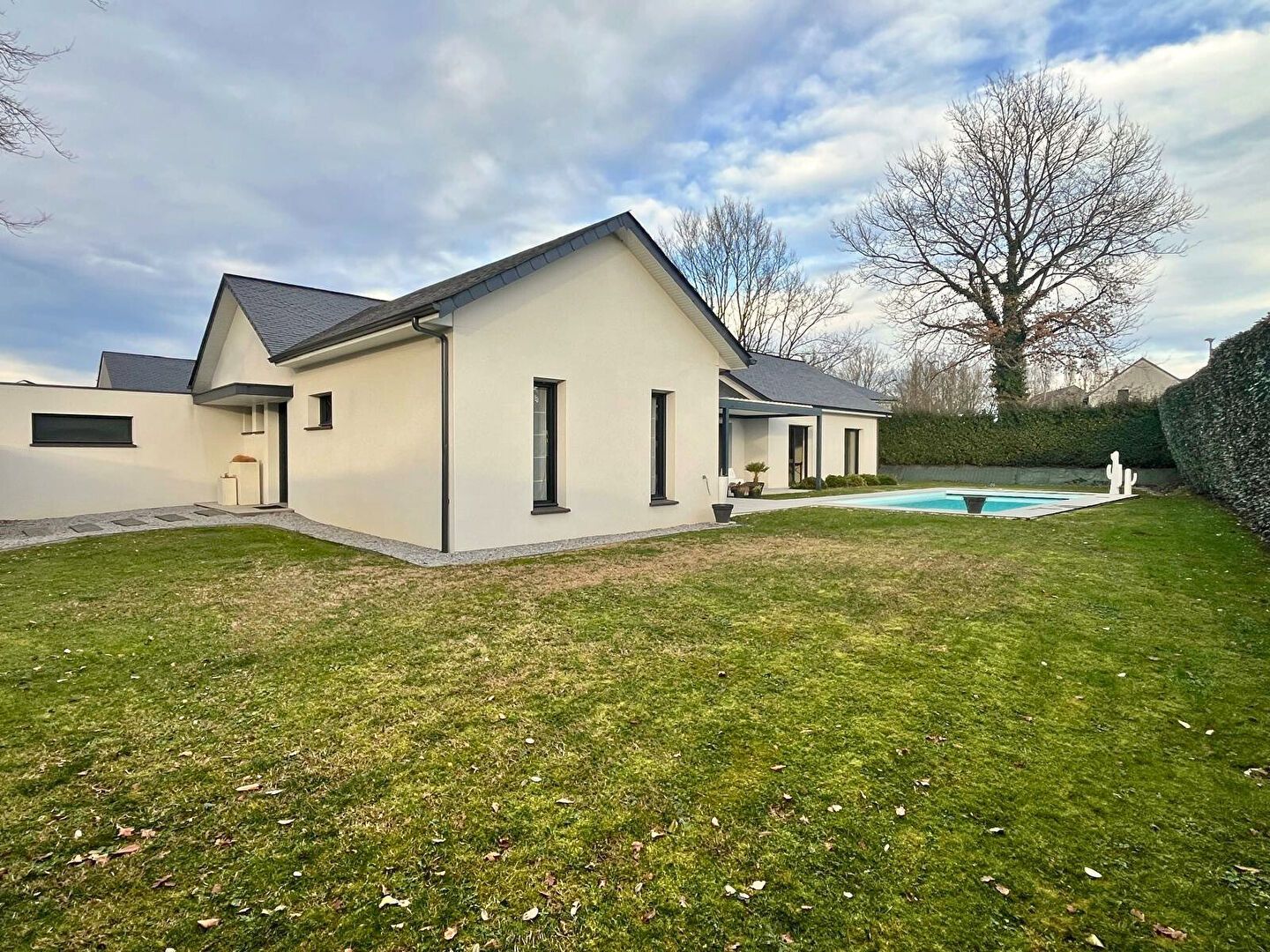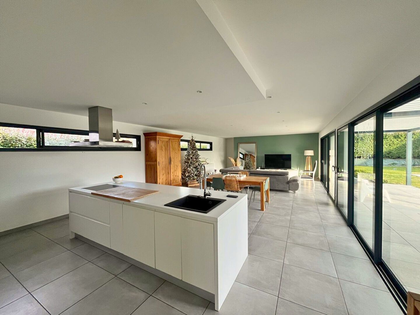 La pièce de vie, spacieuse et ouverte, accueille une cuisine aménagée et équipée qui s'ouvre sur l'extérieur. L'espace nuit se compose de quatre chambres, dont une suite parentale, avec salle de bain et dressing, d'une salle d'eau et de deux WC. Une buanderie, un grand garage. Rien a été laissé au hasard.