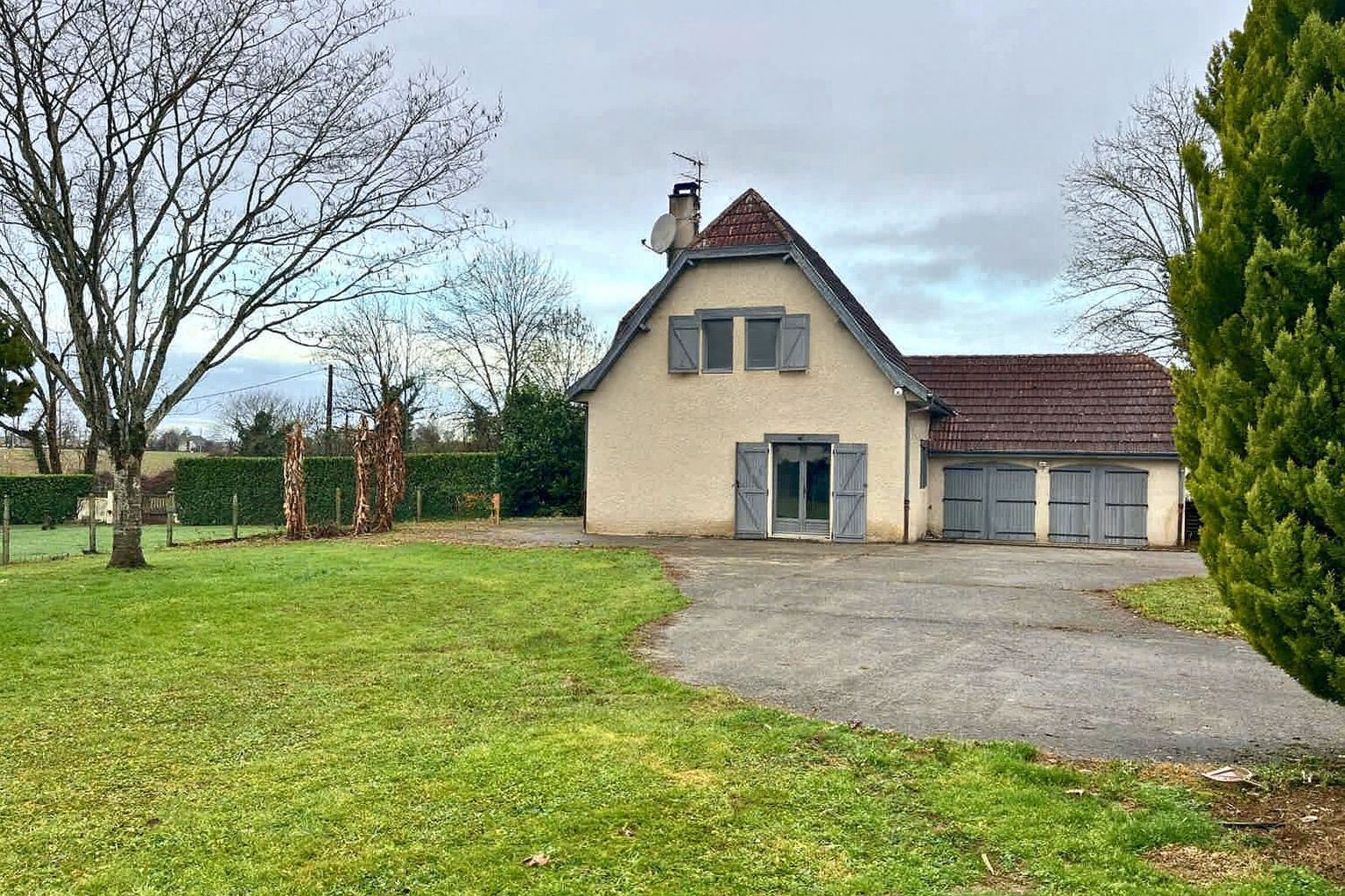 Double garage en façade, facilitant le stationnement et le rangement.